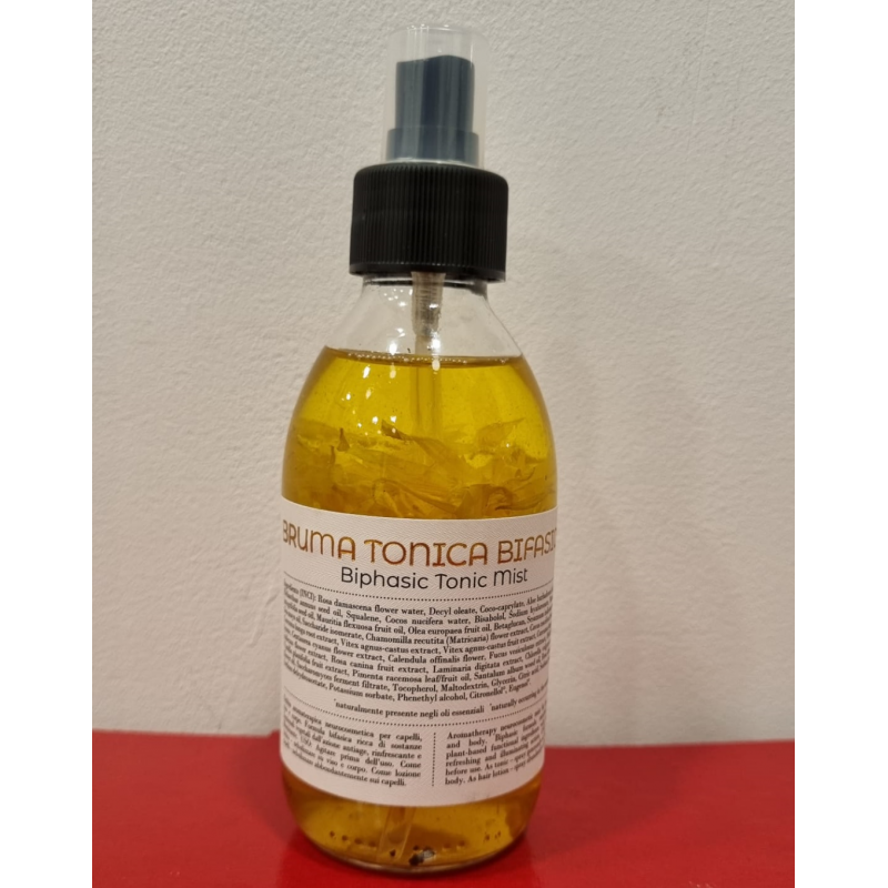Nebbia aromaterapica neurocosmetica per capelli, viso e corpo. Formula Bifasica ricca di sostanze funzionali vegetali dall'azione antiage, rinfrescante e illuminante.